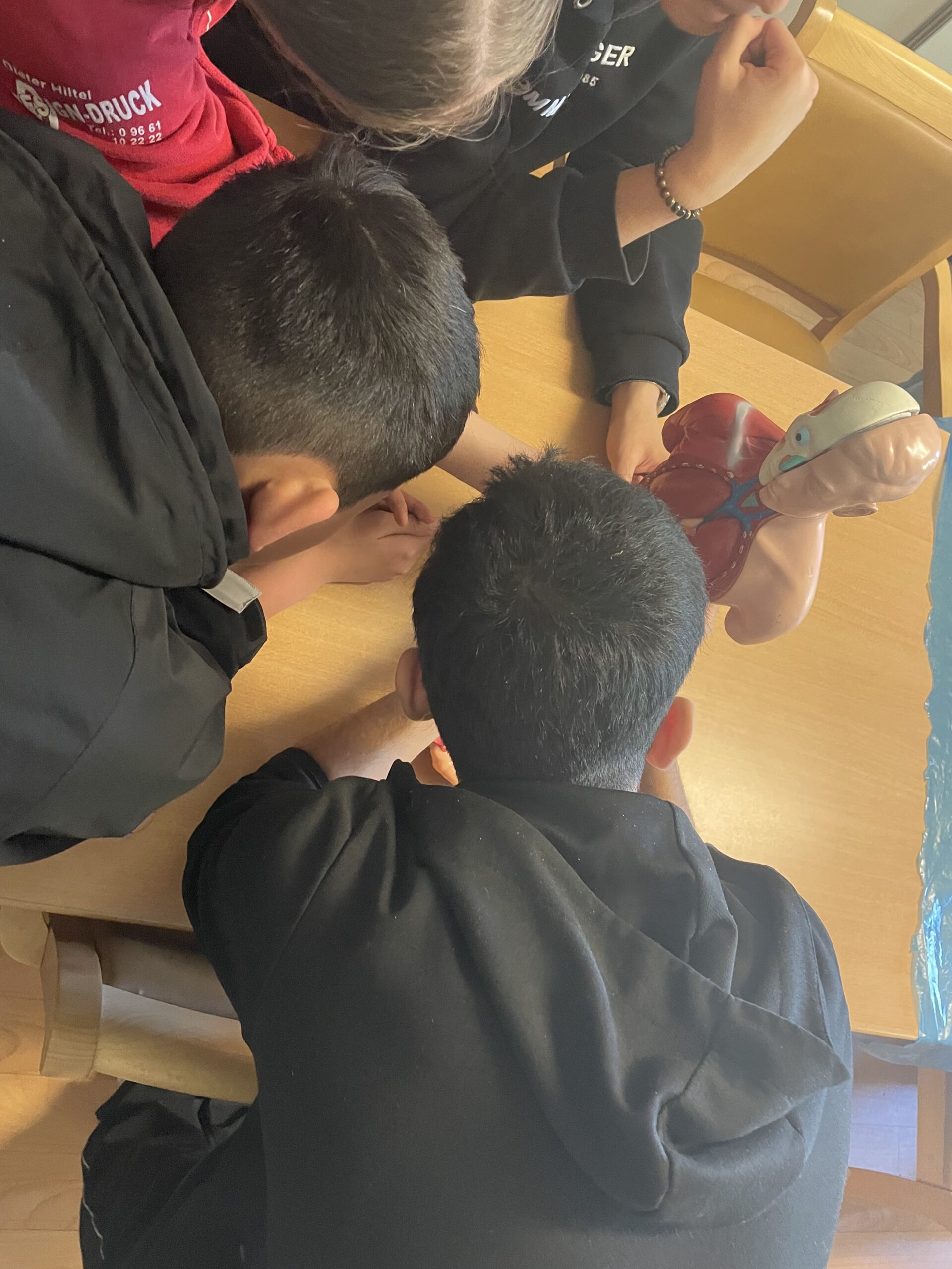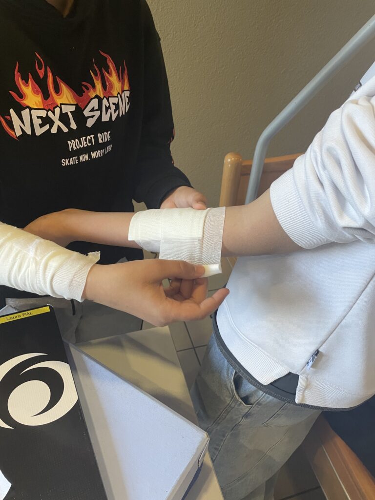 Zur Mittagspause gab es für alle sogar Pizza. Am Nachmittag standen weitere praktische Übungen auf dem Programm. Die Schülerinnen und Schüler konnten unter anderem einen Luftballon rasieren, einen Torso zusammensetzen, Blutdruck messen oder einen Verband anlegen.