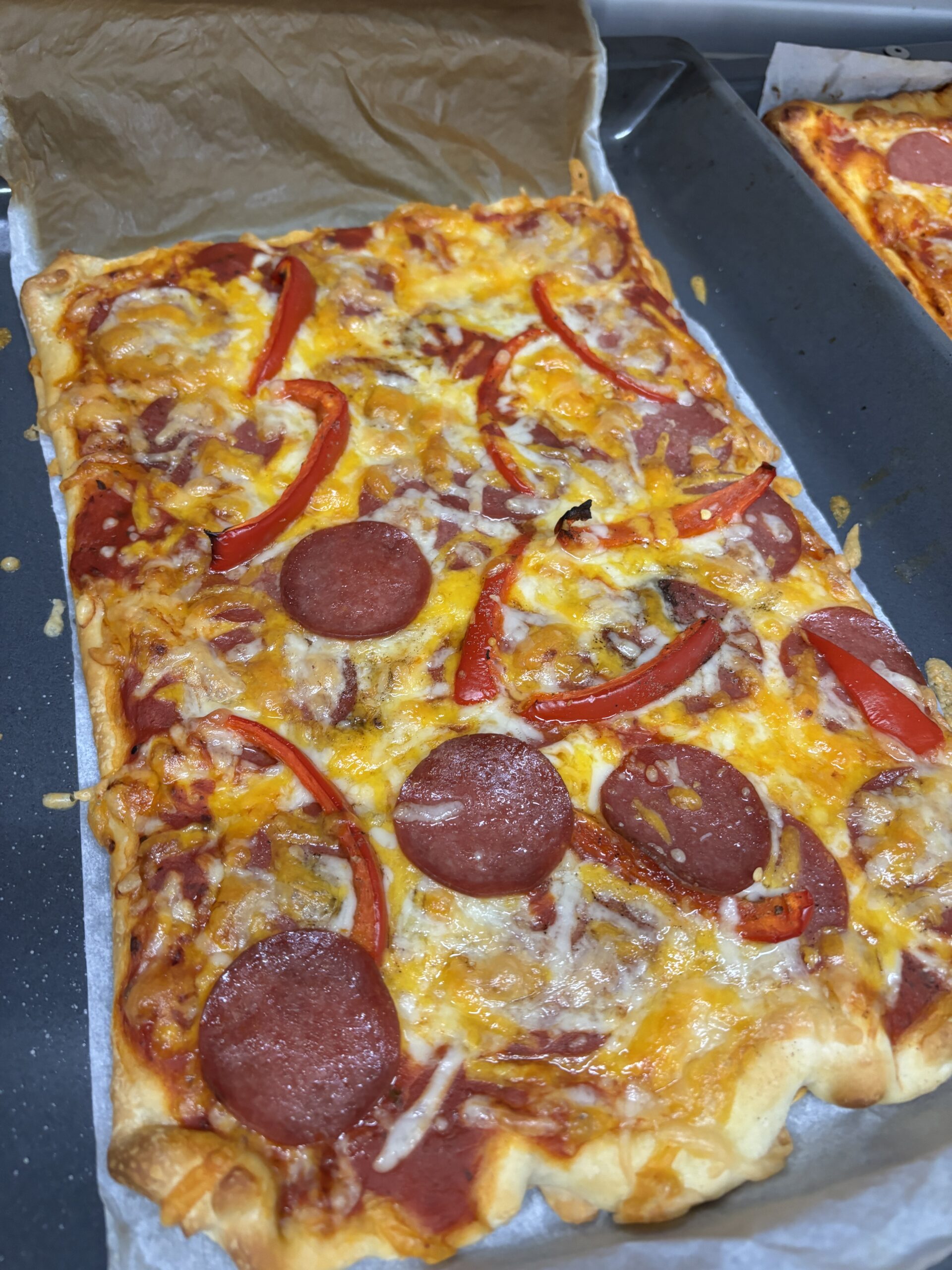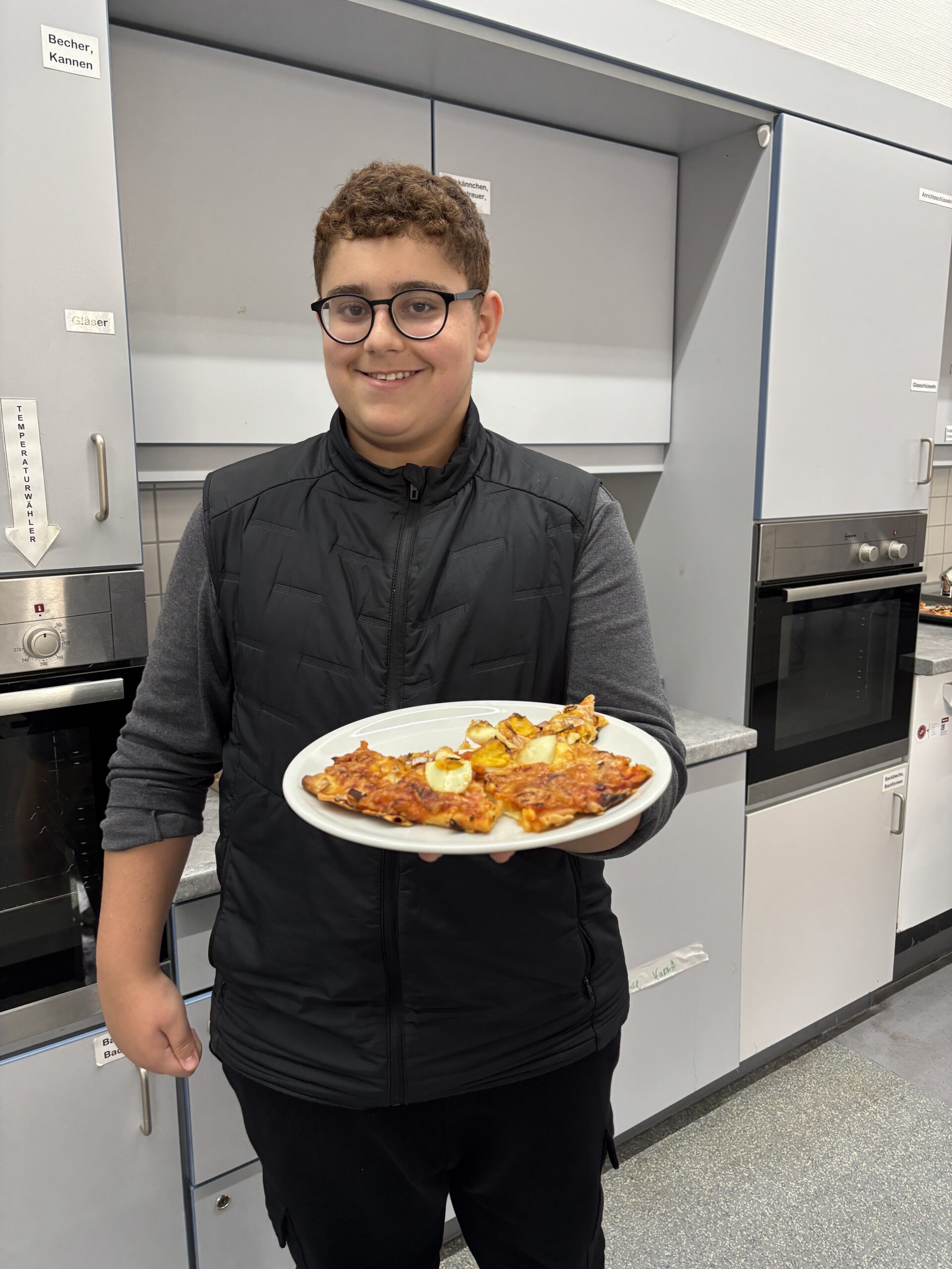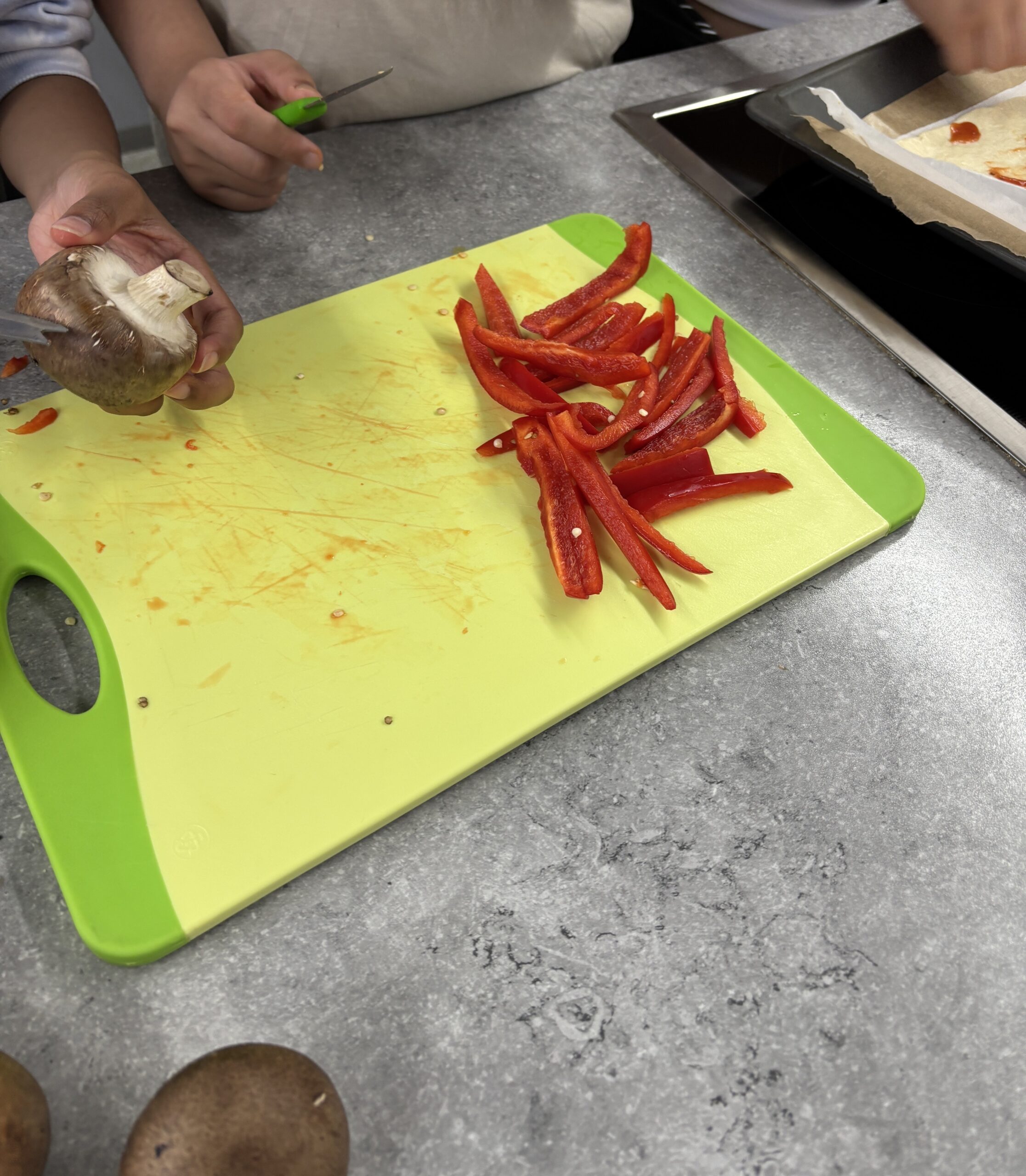Last Tuesday, we went into the school kitchen, divided ourselves into four groups, washed our hands, cut the vegetables and salami. Then we put the tomato sauce, cheese and different toppings on the pizza doughs and baked them for 20 minutes. While the pizzas were in the oven, we did the dishes.