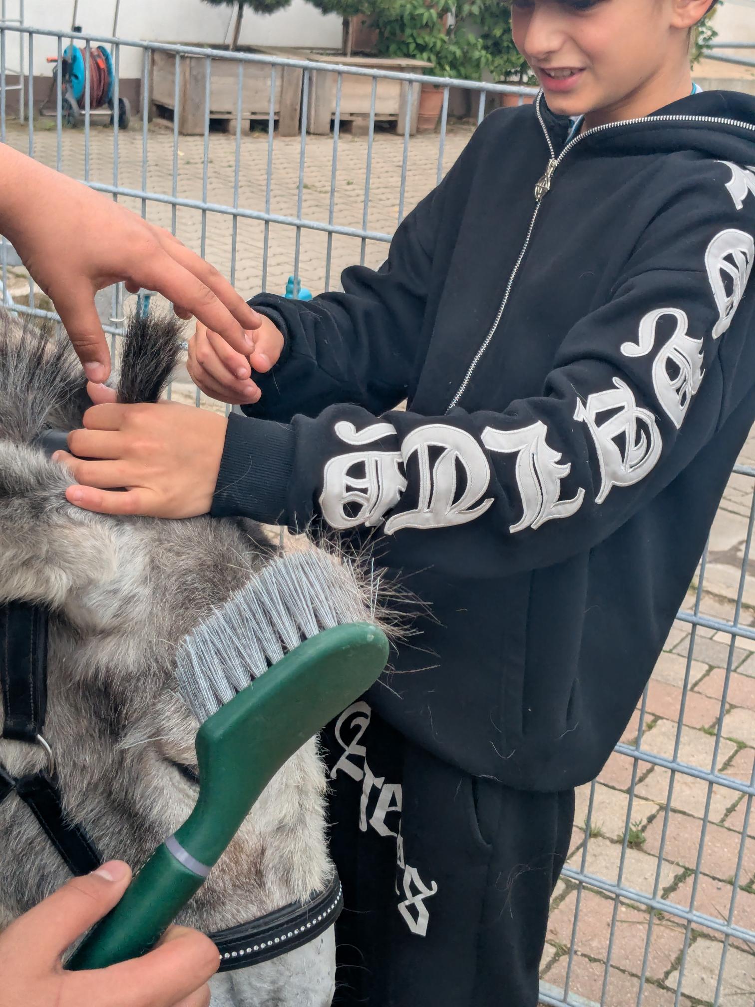 Nachdem die Hofregeln geklärt wurden, durften die Mädchen und Jungen die Esel putzen und knuddeln. Bei dem anschließenden Spaziergang mit den Eseln zeigten die Kinder viel Geduld und schafften es Poldi und Krümel mit Gras und gutem Zureden zu motivieren.