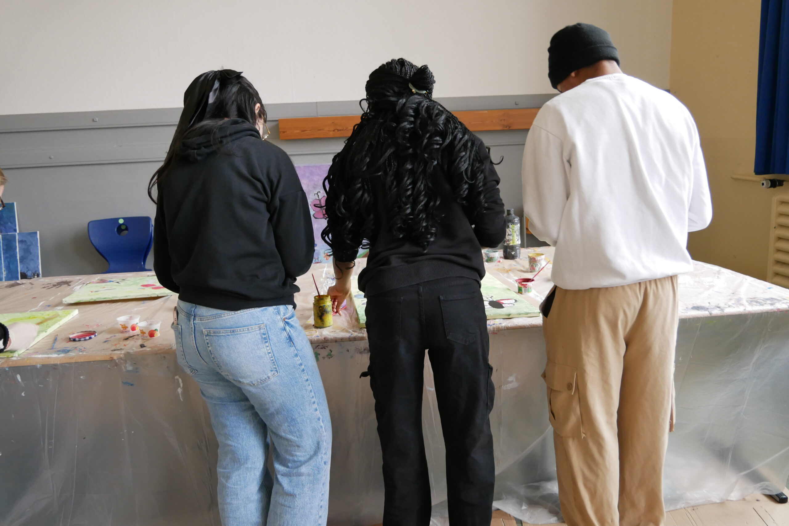 Sie halfen ihnen dabei, die Farben zu mischen, Skizzen anzufertigen und die Leinwände zu bemalen. Das ein oder andere Mal durften die Mittelschüler auch selbst zum Pinsel greifen.