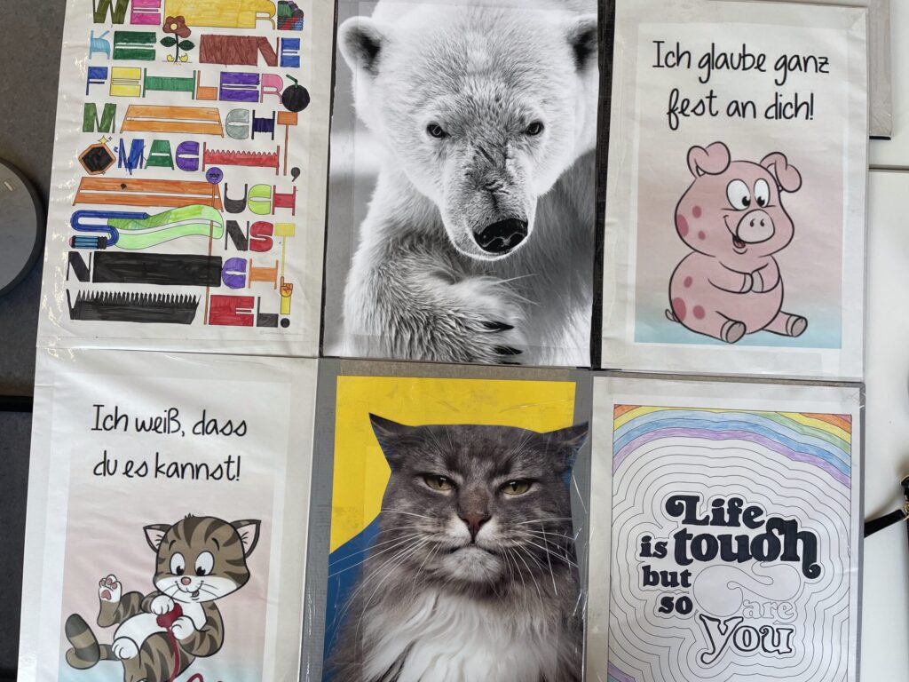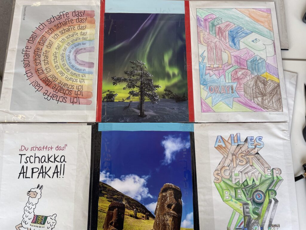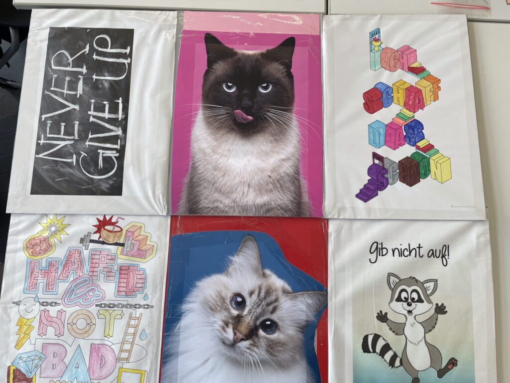 Doch damit nicht genug: Die Schülerinnen und Schüler haben zusätzlich eigene motivierende Sprüche entworfen, die ihre persönlichen Ziele und Gedanken widerspiegeln. Ergänzt werden diese auf der gegenüberliegenden Seite durch einen weiteren inspirierenden Leitsatz, der zum Durchhalten und Weiterdenken anregt.