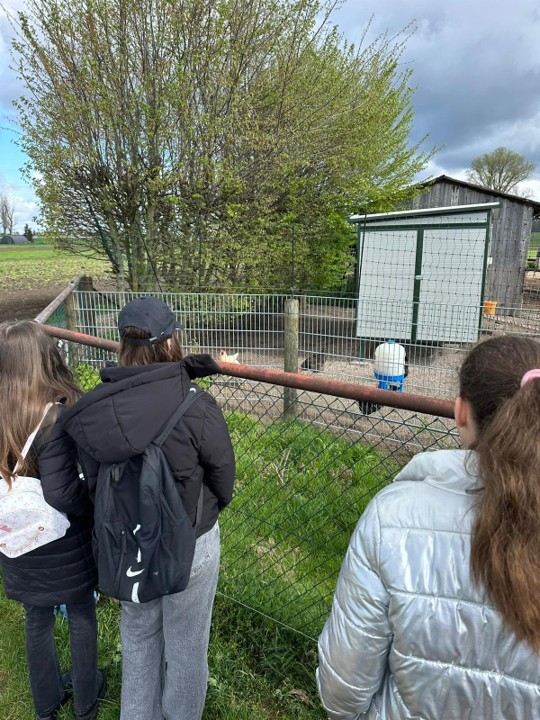 Zu Beginn zeigte sie uns den Hof und stellte uns viele Tiere vor. Besonders begeistert waren die Schülerinnen und Schüler von den Pferden, Pfauen, Eseln, Kaninchen, Fischen, Katzen und natürlich dem wachsamen Hofhund.