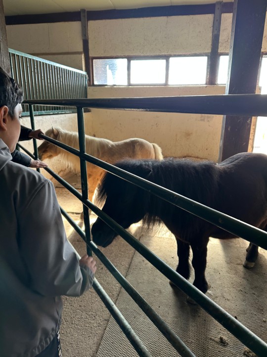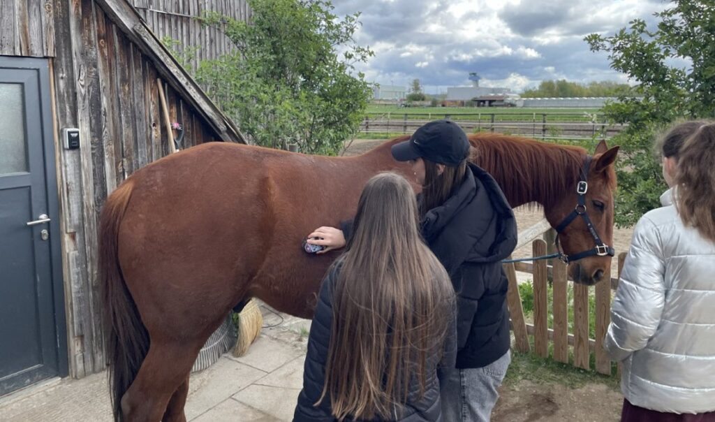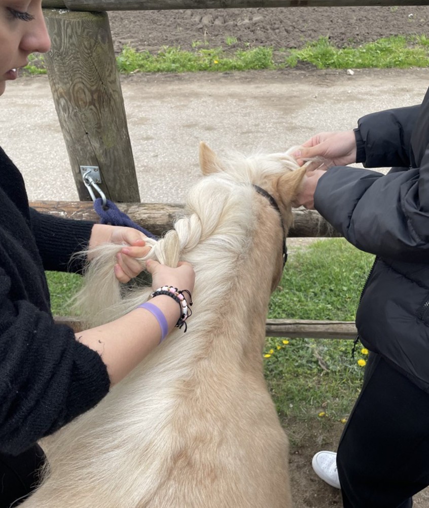 Danach folgte das Highlight des Tages: Die Kinder durften die Ponys sowie zwei große Pferde selbst bürsten und streicheln. Eine Schülerin zeigte dabei besonderes Geschick und flocht den Tieren sogar schöne Zöpfe und Frisuren.