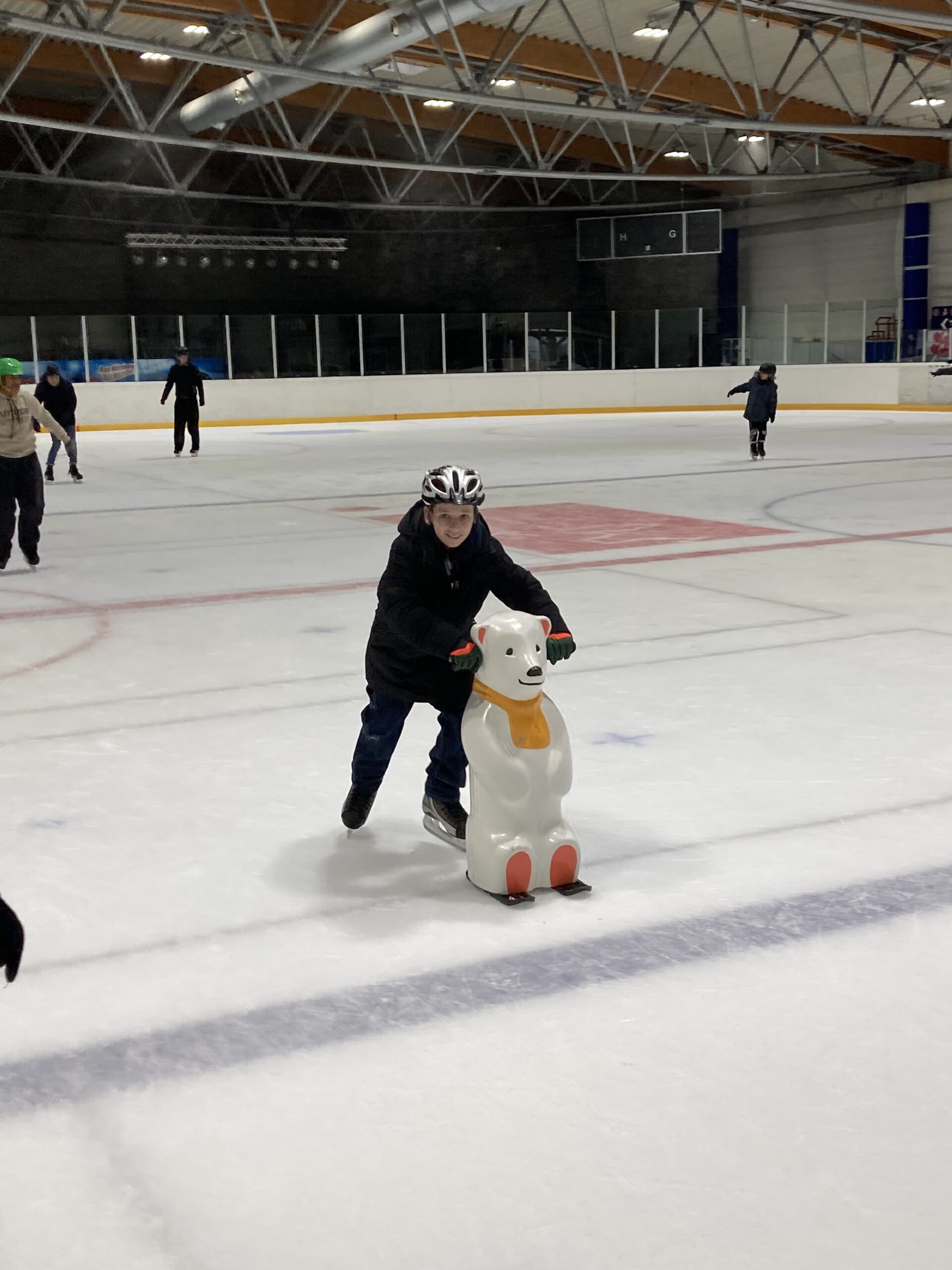 Wir ziehen Schlittschuhe an. Wir fahren auf dem Eis! Der Eisbär und der Pinguin helfen uns. Das Eislaufen ist sehr schön!