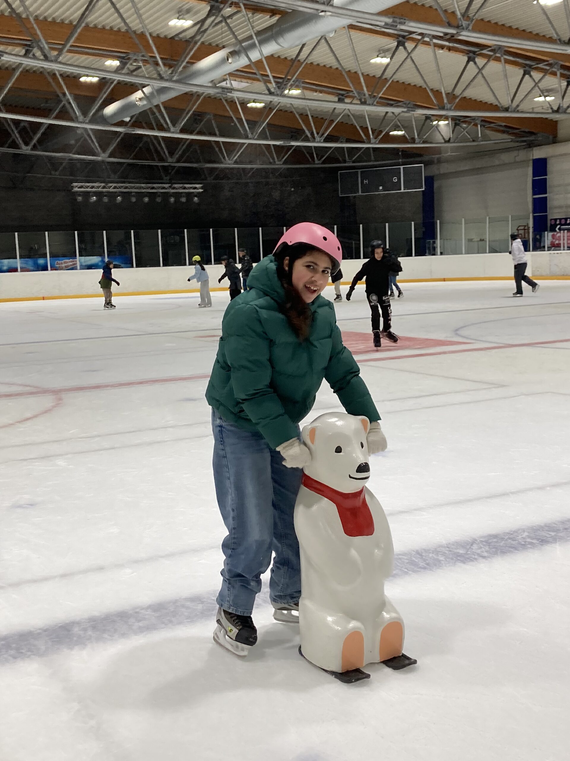 Wir fahren mit der U-Bahn und mit der S-Bahn. Wir laufen zu der ARENA-Eishalle.