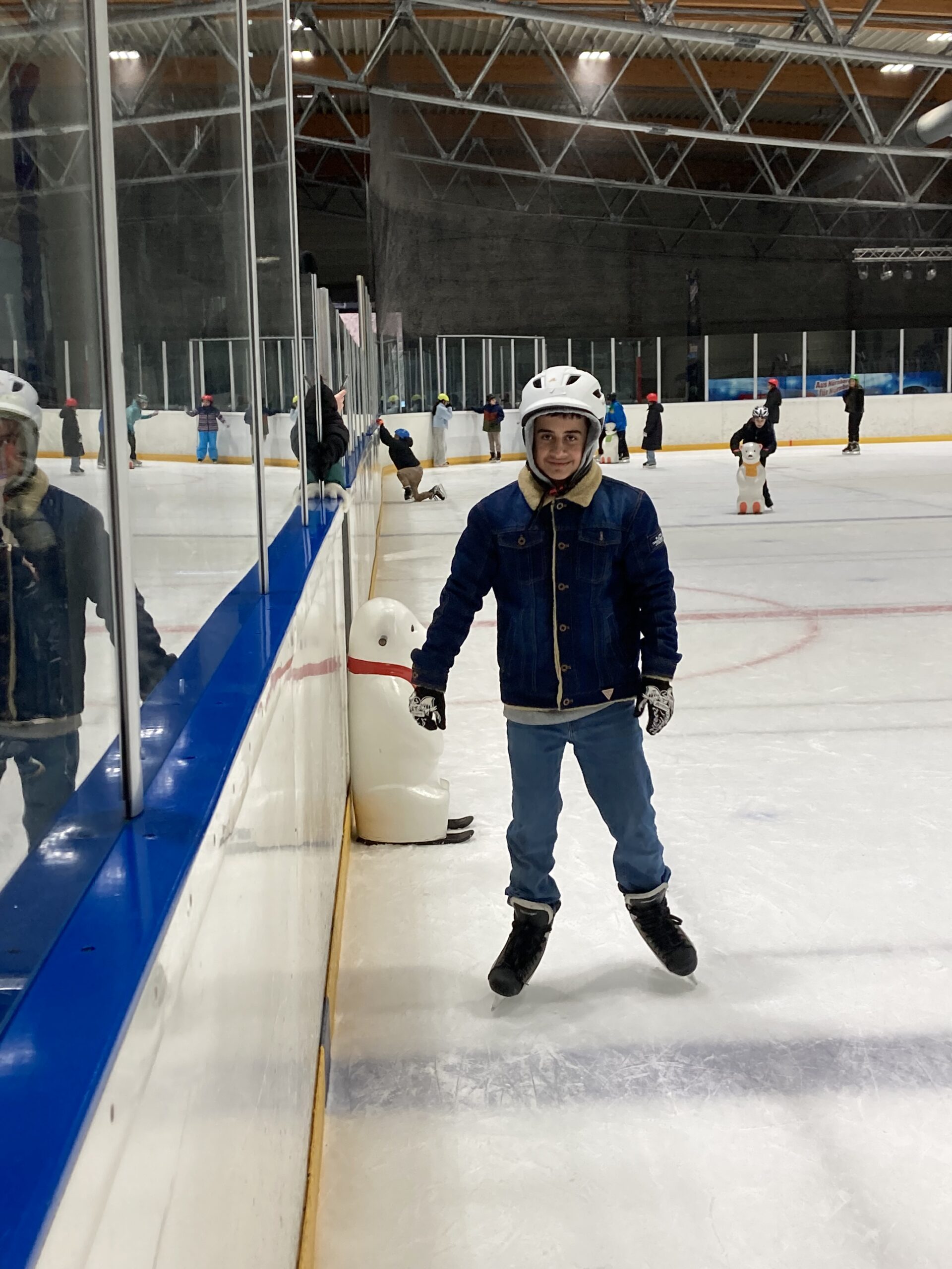 Wir ziehen Schlittschuhe an. Wir fahren auf dem Eis! Der Eisbär und der Pinguin helfen uns. Das Eislaufen ist sehr schön!